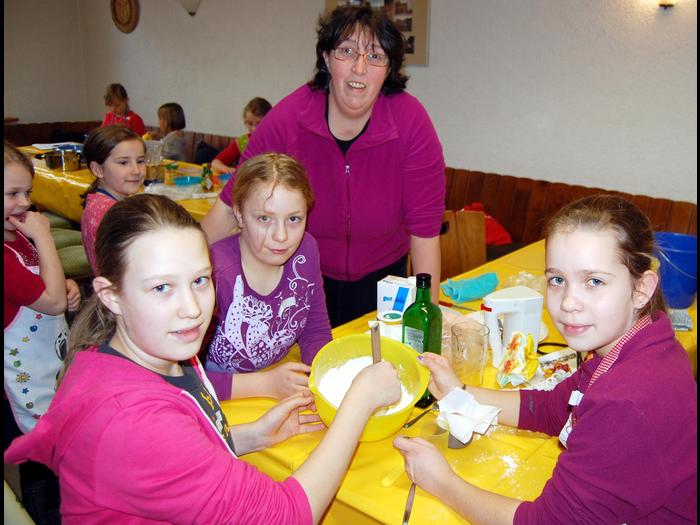 | Janina, Lisa-Nuriel und Sophie (v. li.) rühren Hefeteig für die Apfelschnecken an. Aufmerksam mit dabei Landfrau und Organisatorin Corinna Bender. Foto: Wolfgang Ziegler |